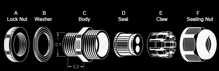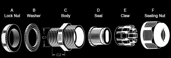 Materials: UL approved Nylon PA66 (Flammability UL 94V-2) for A. C. E. F parts; EPDM rubber for B. D parts.