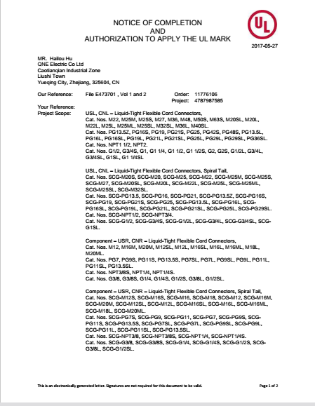 强能电气有限公司拿下UL认证规格型号183项,覆盖尼龙电缆固定头MG、PG、G(PF)、NPT型(连体),耐扭式电缆固定头MG、PG、G(PF)、NPT(连体),大大丰富原有UL认证规格型号,为客户提供更多更齐全的选择。