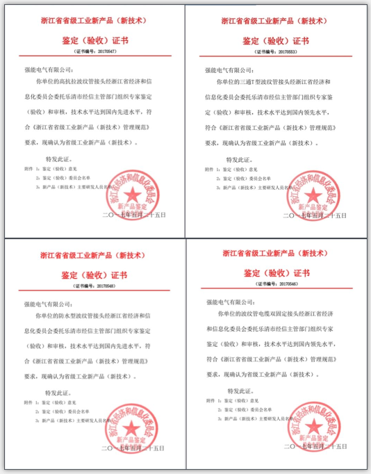 2017年05月13日在乐清市主持召开了“波纹管电缆双固定接头”“三通T型波纹管接头”“防水型波纹管接头”“高抗拉波纹管接头”(备案号:浙经信技术【2016】