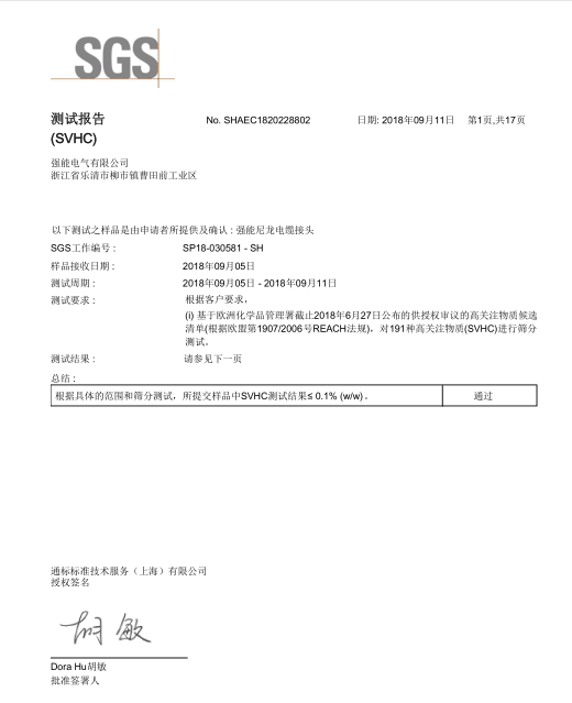 通过REACH,191种高关注物质(SVHC)进行筛分测试。