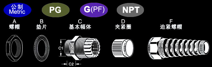 公制牙(Metric), PG牙、G(PFBSP/PS)牙、NPT牙。
