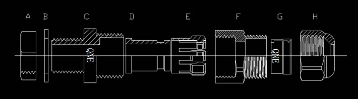 产品材质:A, C, F, H部分以黄铜镀镍制成;E部分以UL认可之尼龙PA66制成(防火等级UL94V-2);
