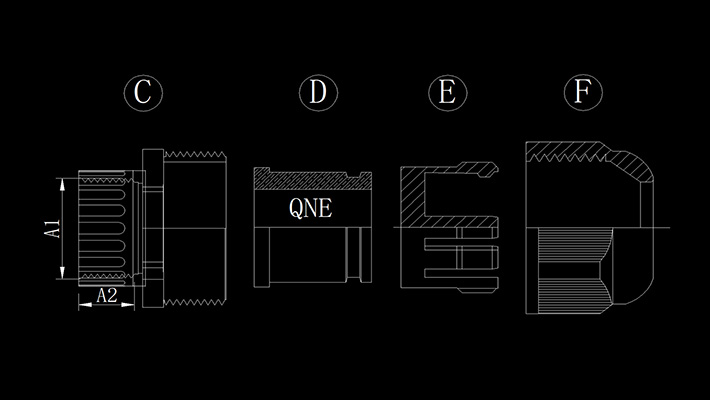 产品材质:C.F部分采用UL认可之无卤素(Halogen-Free)尼龙PA66(防火等级UL94V-2)制成;(可定制UL认可的V-0防火等级尼龙原料);D部分采用三元乙丙(EPDM)耐候橡胶制成。(可定制耐寒、耐高温橡胶;耐高酸碱、耐化学与抗腐蚀橡胶)。