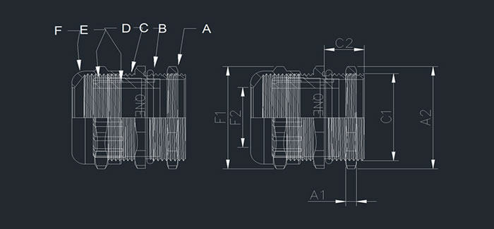 产品材质:A.C.F部分以aluminium制成,E部分以UL认可之尼龙PA66制成(防火等级UL94V-2),BD部分采用EPDM耐候橡胶制成。(可定制耐寒、耐高温橡胶;耐高酸碱、耐化学与抗腐蚀橡胶)。